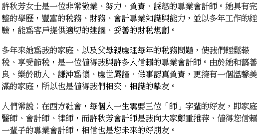 What we really appreciate is her willingness to go to extra lengths to keep her promises as exemplified in her taking the time to research thoroughly when we asked her to do our daughter's US tax return as well. We highly recommend her because of her expertise and excellent work ethics. We are happy that Florence is not only our accountant, but our family friend now and we wish her every success in her business." Laurence and Alice Ma, Vancouver